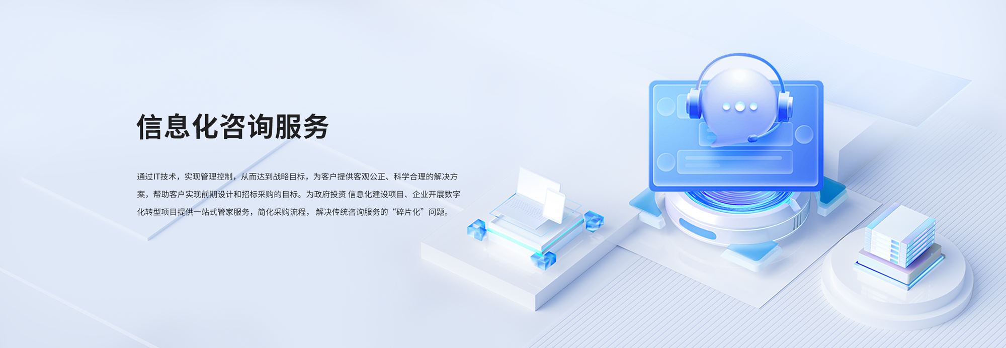 为政府投资 信息化建设项目、企业开展数字化转型项目提供一站式管家服务,简化采购流程, 解决传统咨询服务的“碎片化”问题。