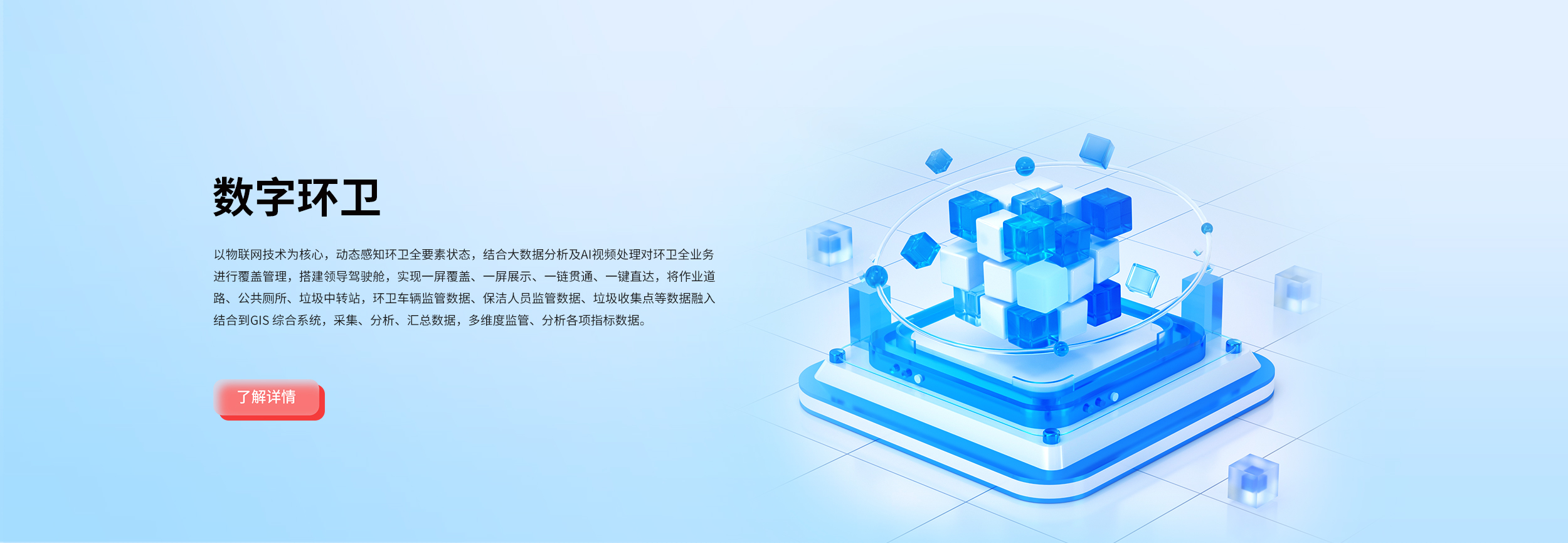 实现一屏展示、一链贯通、一键直达,通过环卫数据进行整合,把实时、客观数据的归集、分析应用,以物联网数据集成打破数据孤岛,实现数据穿透、回流,为环卫作业实时监管、工作效率、成本支出提供有效的数据支撑。