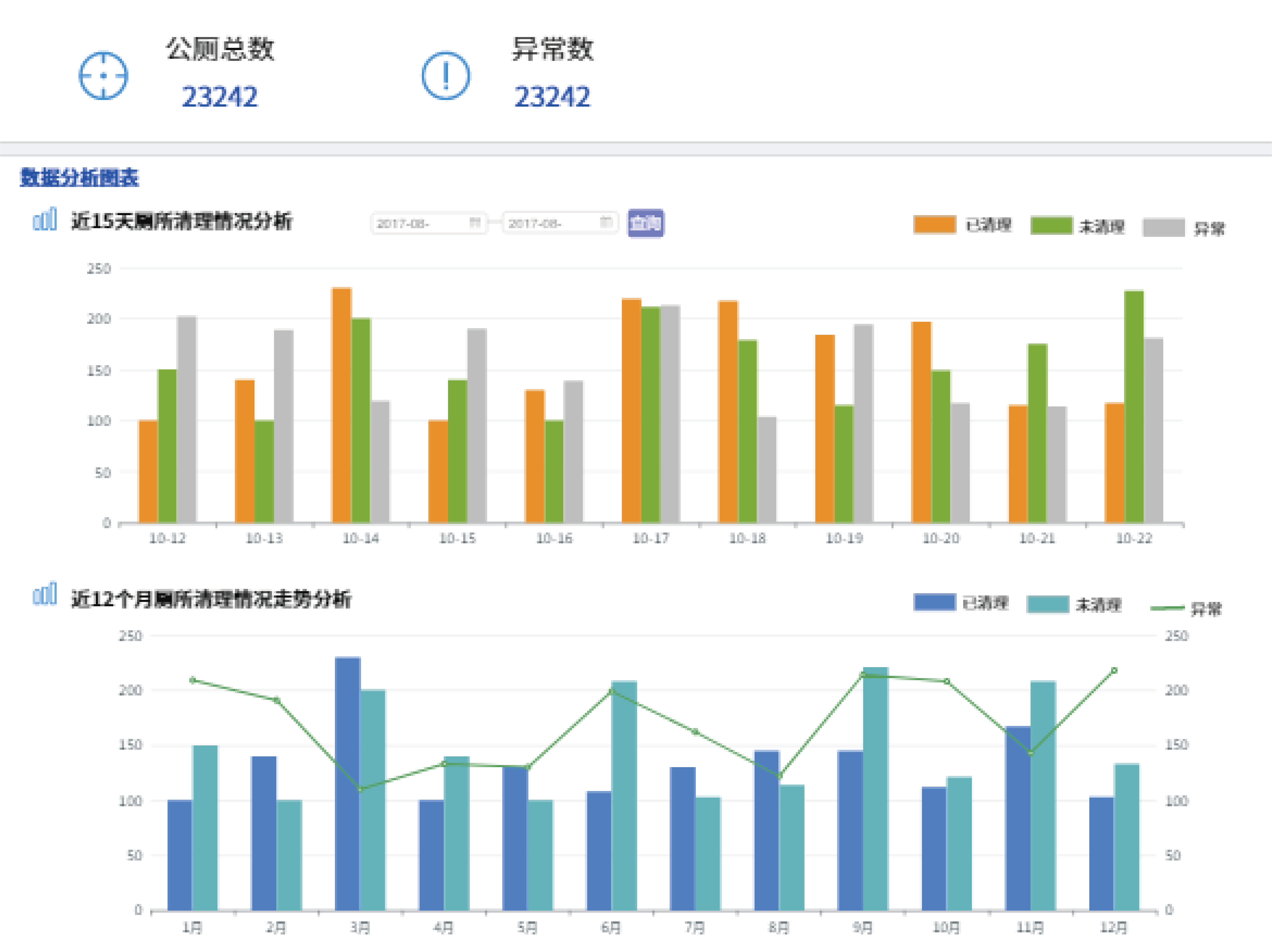 以车辆档案、人员档案、环卫设施档案为基础数据,通过关联的众多物联设备采集、发送、汇总对应阈值数据,多维度监管、分析各项指标数据。以数据报表+数据视图的形式,多方位展示环卫数据。环卫数据综合汇总,对日常环卫工作开展一目了然、监管快捷。