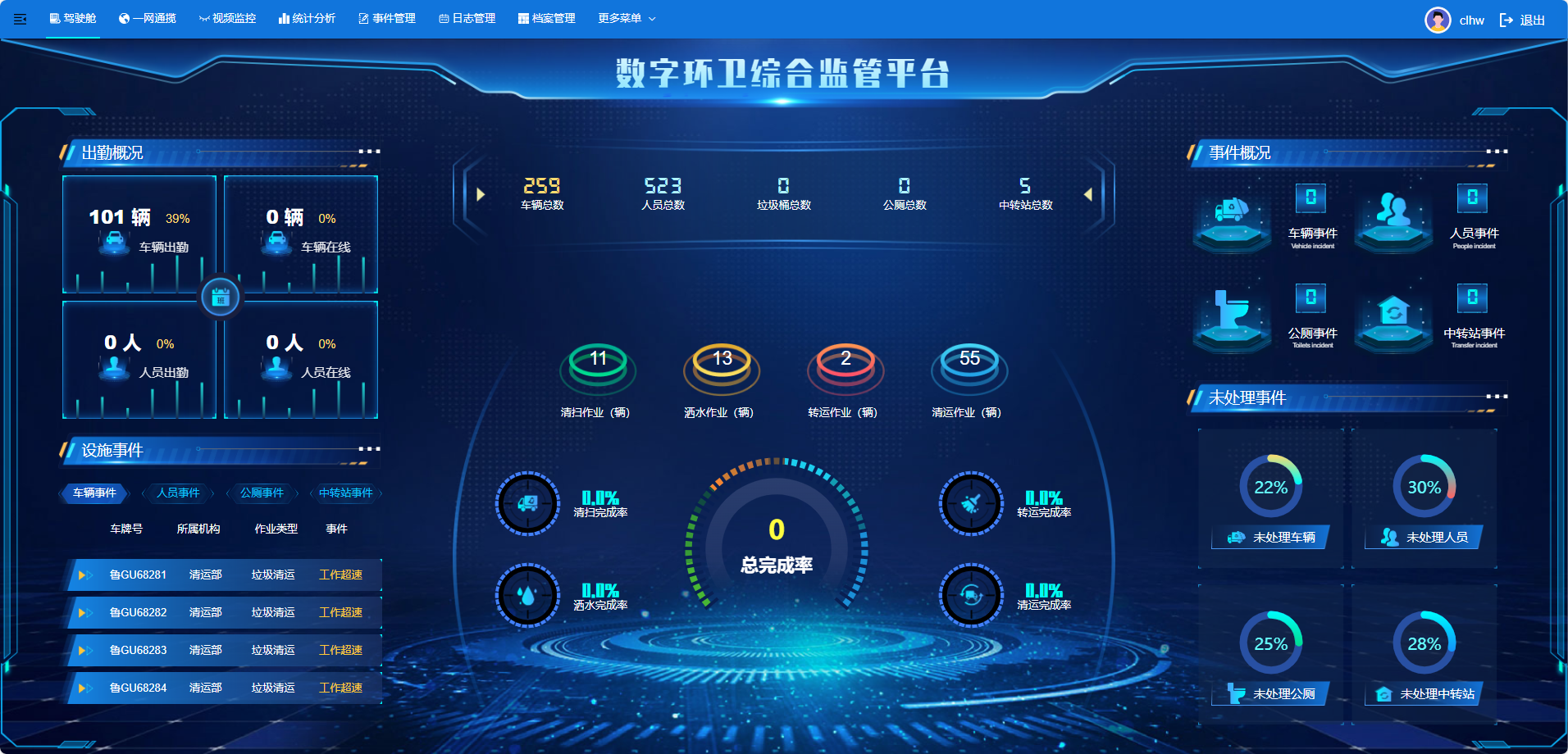 作业道路、公共厕所、垃圾中转站,环卫车辆监管数据、保洁人员监管数据、垃圾收集点等数据融入结合到GIS综合系统中,将管辖范围内的所有环卫数据、空间数据进行整合,实现环卫作业一张网可视化、数字化管理。保洁作业完成情况、垃圾收运的处理情况、异常事件的统计及各种告警信息一屏展示,可以直观的了解环卫运行态势和暴露出的问题,对科学决策提供有力的数据支撑。